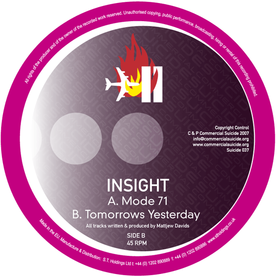 Label : Commercial Suicide Cat. No. : SUICIDE 037 Artist : Insight (DJ Insight on rolldabeats) Side A : Mode 71 Side B : Tomorrows Yesterday Credits : Written & produced by Mattjew Davids (No spelling mistake. it's a joke) Release date : May 2007 Have attached label images as proof.